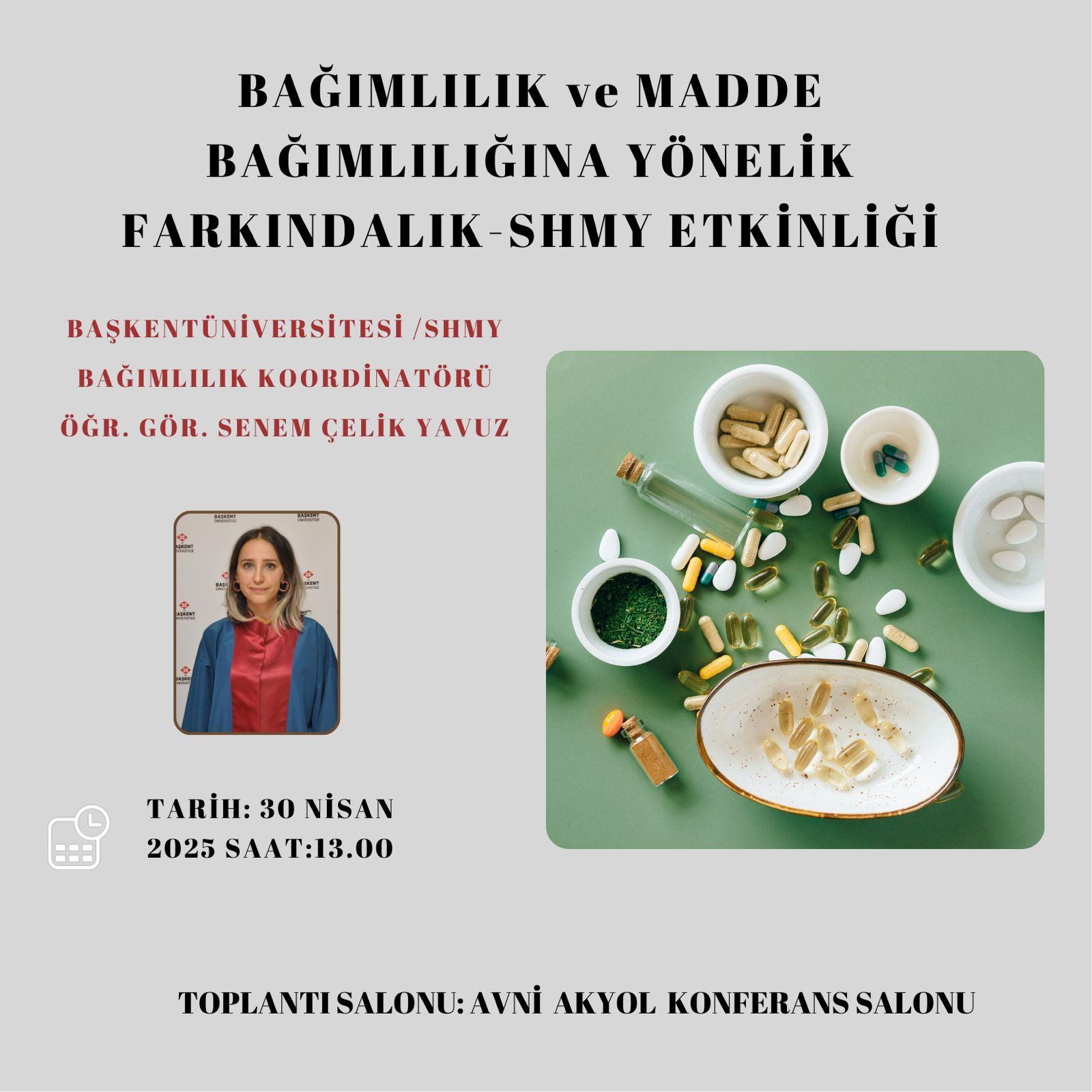 Yüksekokulumuzun İlk ve Acil Programı / SHMY Bağımlılık Kordinatörü Öğr. Gör. Senem Çelik Yavuz 'un düzenlediği "BAĞIMLILIK VE MADDE BAĞIMLILIĞINA YÖNELİK FARKINDALIK" Shmy Etkinliği 30 Nisan 2025 tarihinde saat 13:00 'da Avni Akyol Konferans Salonunda yapılacaktır.