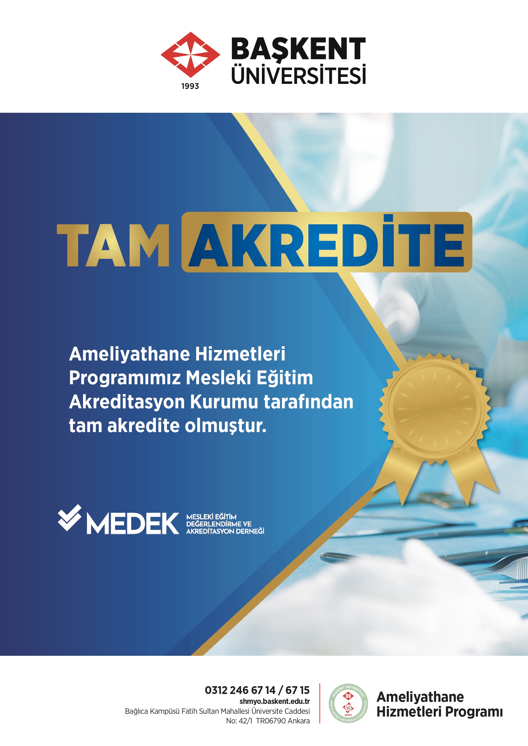 Başkent Üniversitesi Sağlık Hizmetleri Meslek Yüksekokulu Ameliyathane Hizmetleri Programımız, MEDEK tarafından yapılan değerlendirmeler sonucunda Tam Akredite edilmiştir. Elde edilen bu akreditasyon, programımızın eğitim kalitesinin ve akademik yeterliliğinin önemli bir göstergesidir.