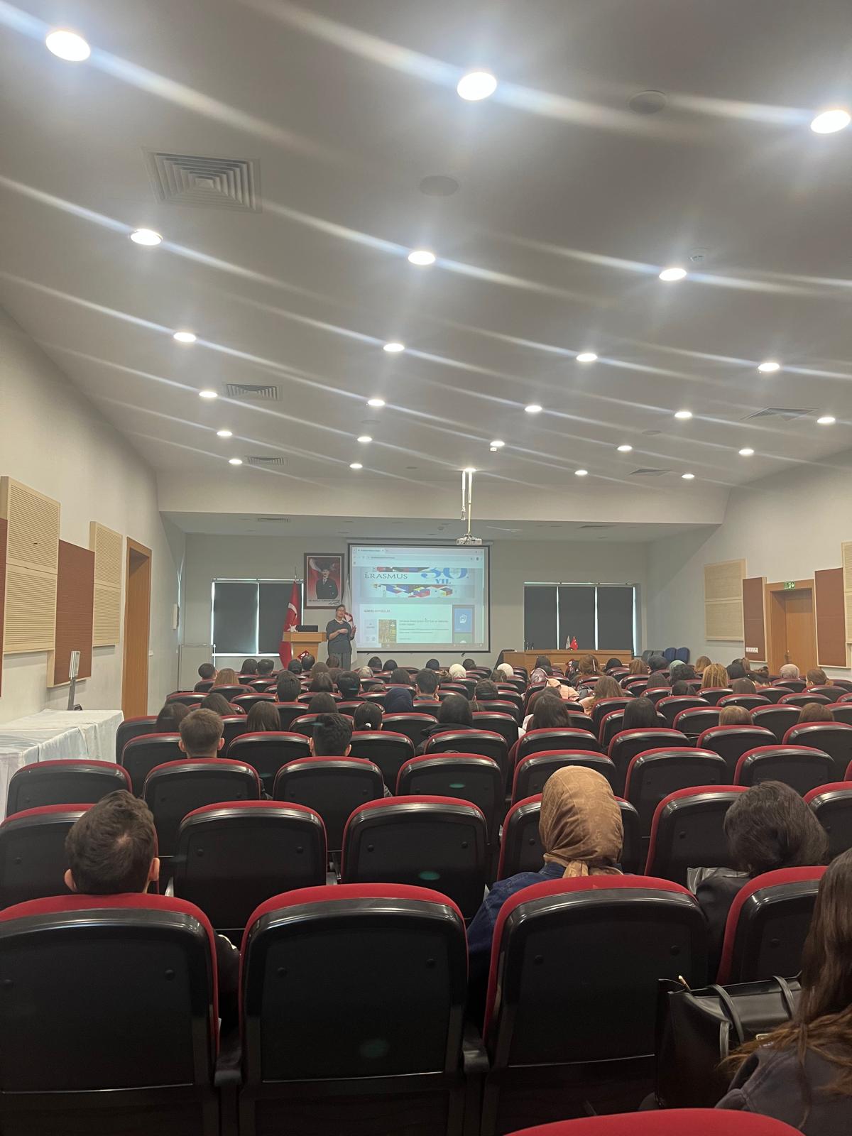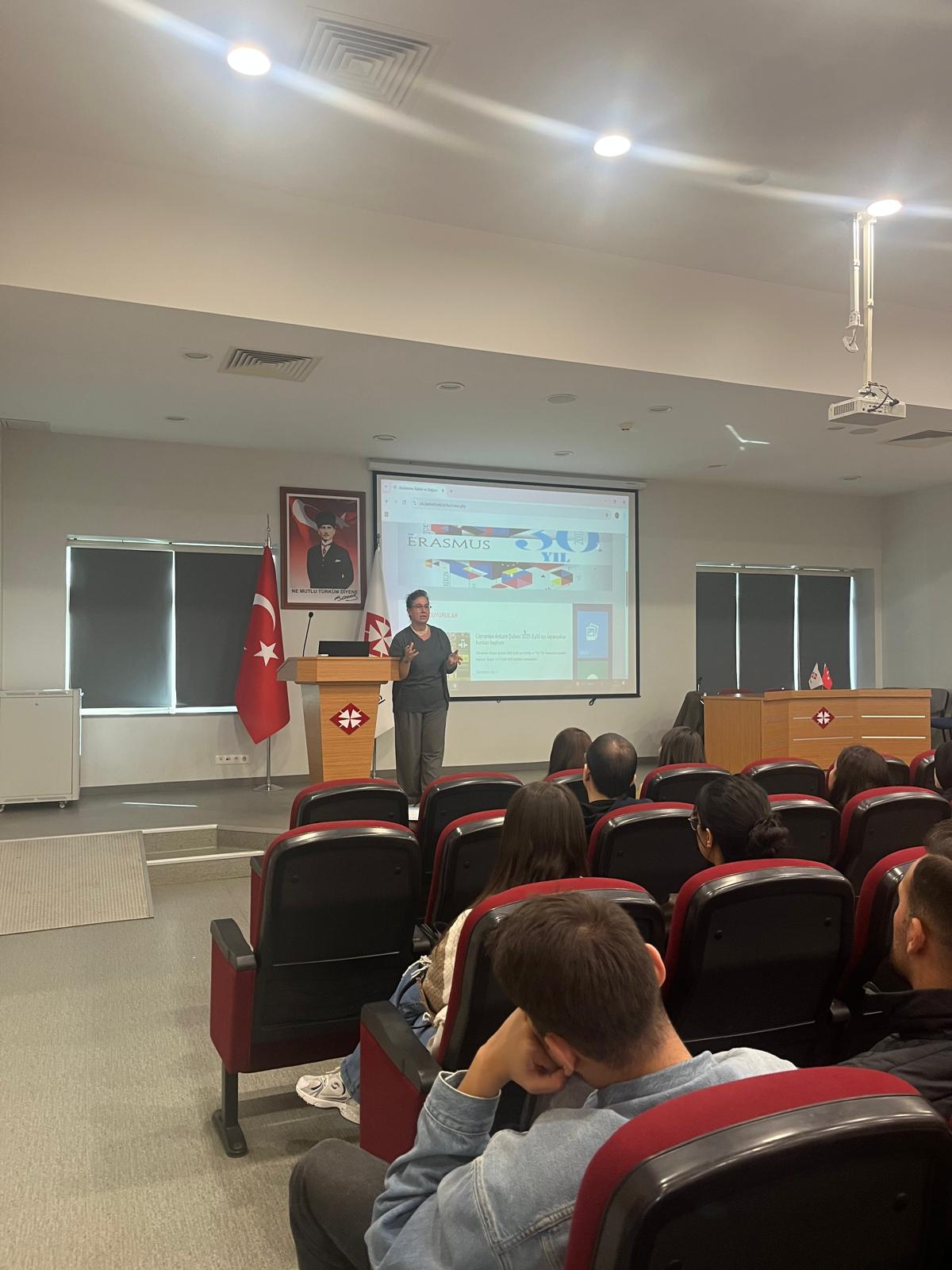 Sağlık Hizmetleri Meslek Yüksekokulu'nun, yürütücüsü Öğr. Gör. Mervesu Gökyürek'in, konuşmacısının Senem Güdenler'in olduğu 30.10.2025 tarihinde gerçekleştirdiği Erasmus öğrenci hareketliliği kapsamında düzenlenen bilgilendirme toplantısı, öğrencilerin uluslararası eğitim ve staj olanaklarına yönelik farkındalıklarını artırmış; sağlık hizmetleri alanında küresel ölçekte kullanılan yöntem, teknoloji ve uygulamalar hakkında bilgi edinmelerine zemin hazırlamıştır. Toplantı, öğrencilerin alanlarında karşılaştırmalı akademik değerlendirme yapmalarına, farklı ülkelerdeki sağlık hizmetleri yaklaşımlarını anlamalarına ve bilimsel meraklarının güçlenmesine katkı sağlamıştır.