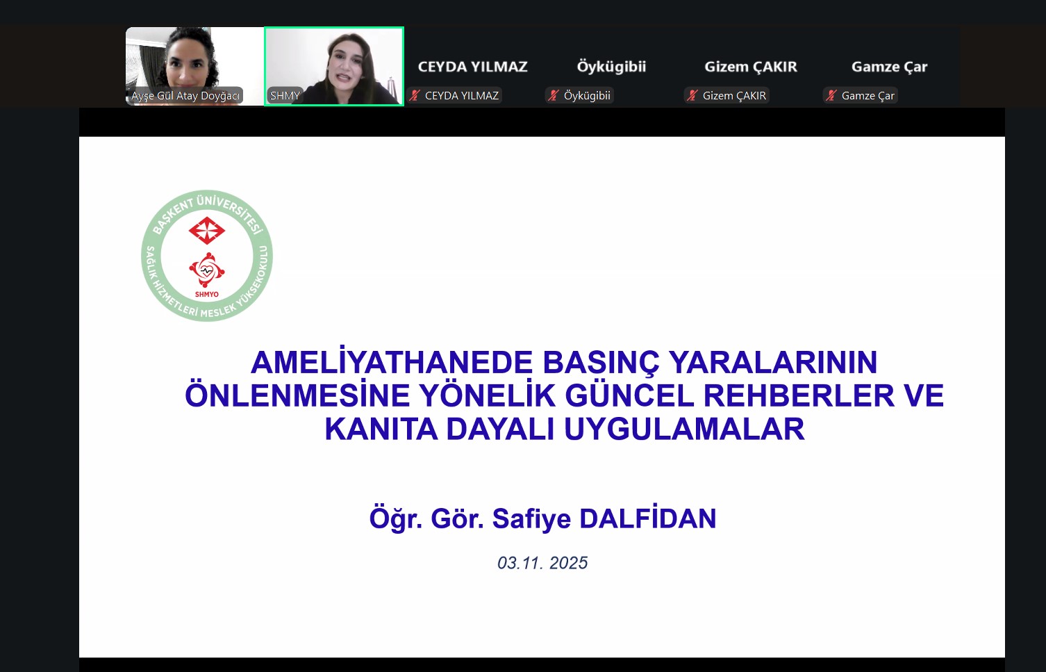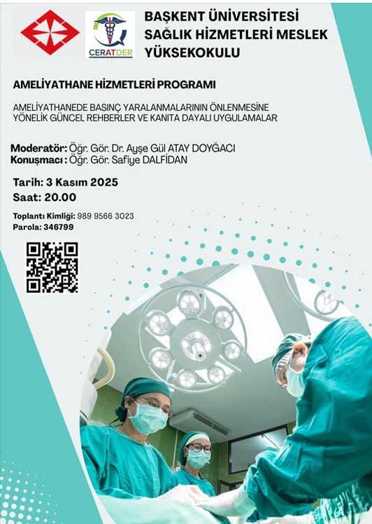 Sağlık Hizmetleri Meslek Yüksekokulu Ameliyathane Hizmetleri Programının yürütücüsünün Öğr. Gör. Dr. Ayşe Gül Atay Doyğacı'nın olduğu 3.11.2025 tarihinde online olarak düzenlenen Ameliyathanede Basınç Yaralanmalarının Önlenmesine Yönelik Güncel Rehberler ve Kanıta Dayalı Uygulamalar toplantısında; ameliyathane ortamında gelişebilecek basınç yaralanmalarının önlenmesine yönelik güncel rehberler, kanıta dayalı uygulamalar ve hemşirelik yaklaşımlarına ilişkin farkındalık oluşturmak ve öğrencilerin bu konuda bilimsel temelli bilgi ve becerilerini geliştirmek amacıyla düzenlenmiştir.